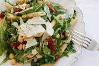 - Toss the pasta with baby arugula, sun dried tomatoes, chick peas, oil, vinegar, half of the cheese, salt and fresh cracked pepper to taste. Divide between 4 plates and top with remaining shaved parmesan cheese.